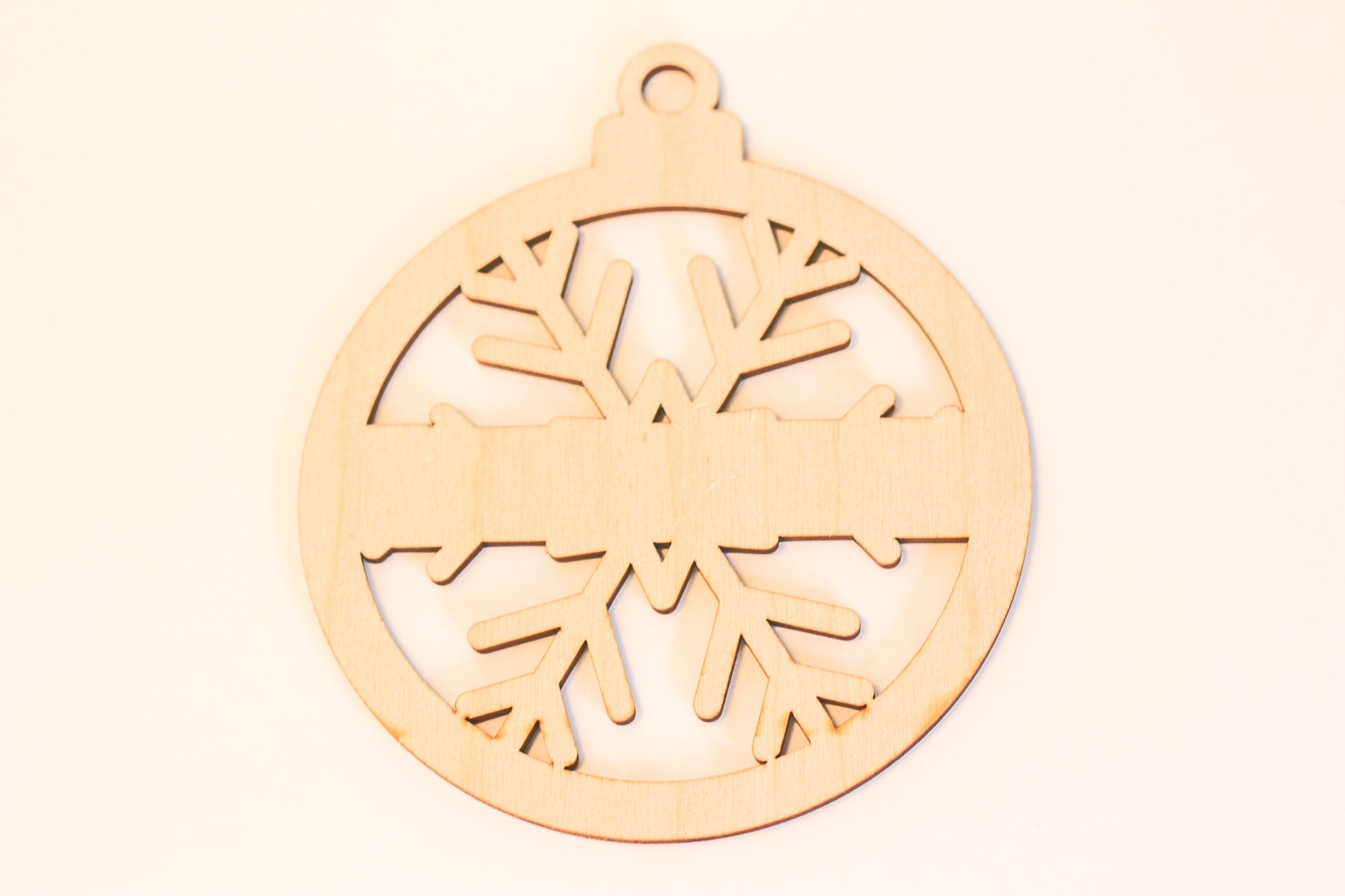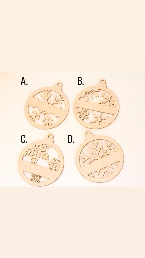 Christmas ball shaped wooden ornaments with various snowflake patterns.