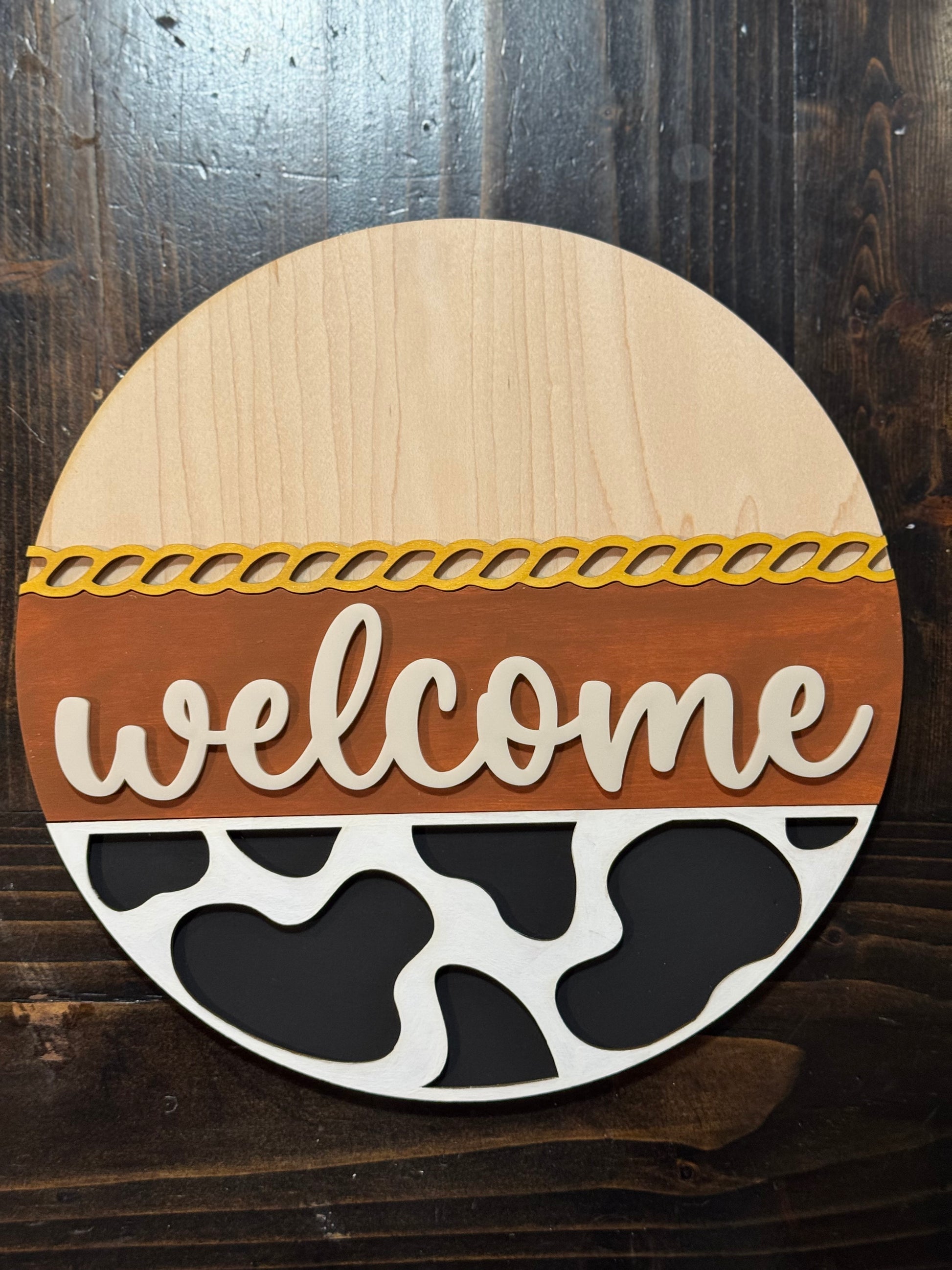 9” round "welcome" sign of mixed acrylic and wood pieces.